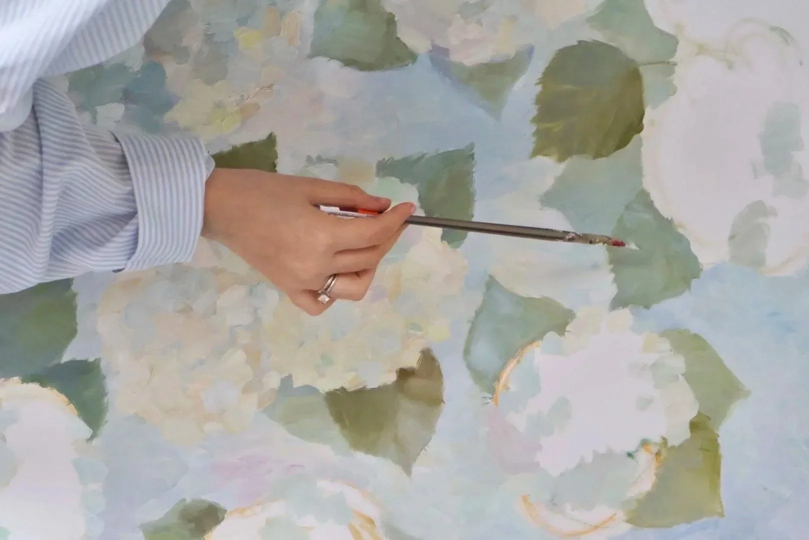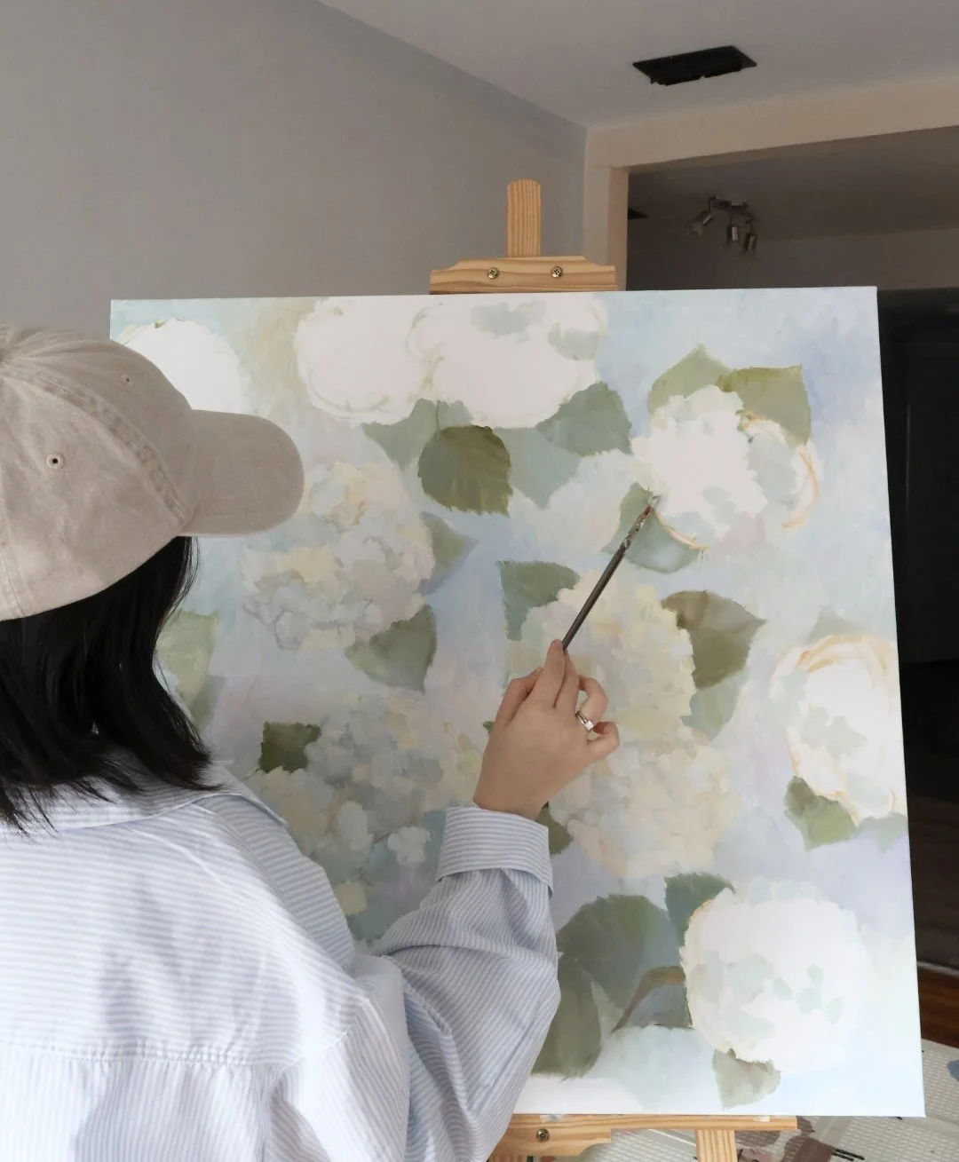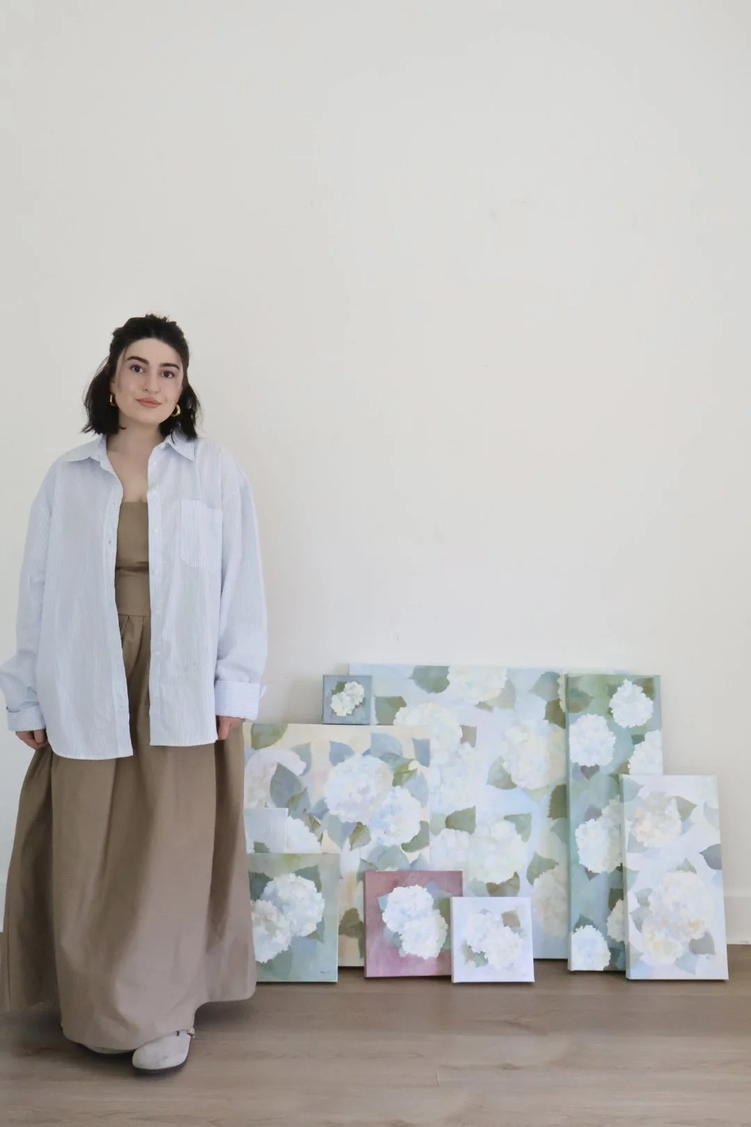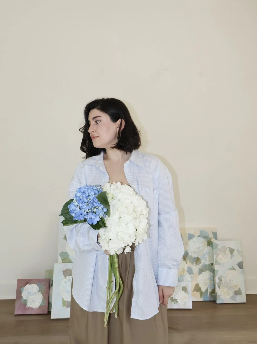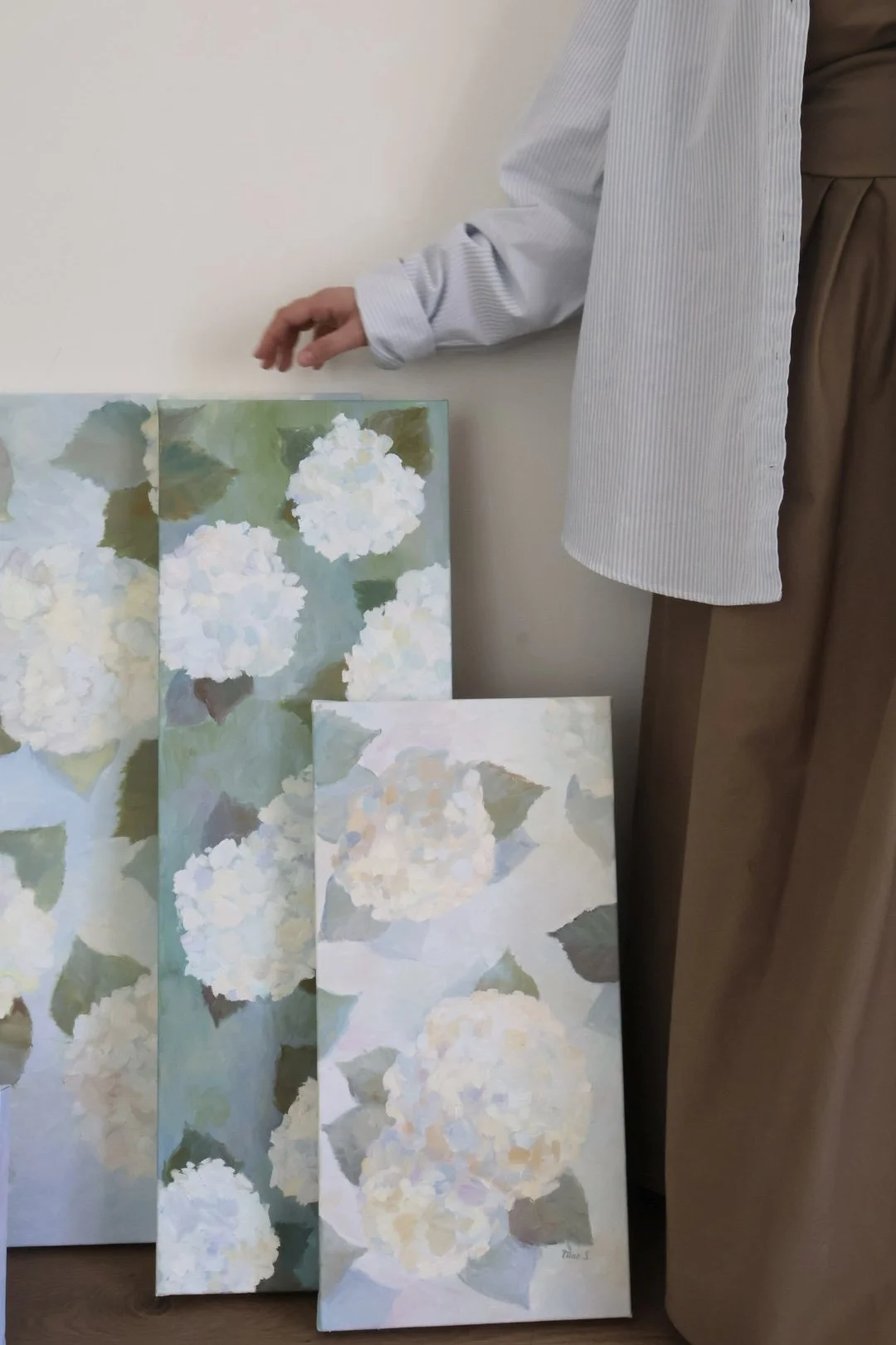 In 2026 she began working on the series In Bloom — Memories of Motherhood, inspired by the quiet emotional transformation that comes with becoming a mother. For this collection she chose hydrangeas — flowers that accompanied her throughout her early experience of motherhood. Through soft color palettes and expressive palette-knife textures, the paintings explore tenderness, growth, and the beauty of everyday moments.